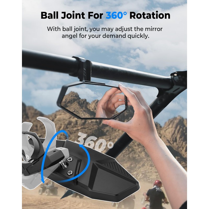 - Personalized Adjustment: The UTV mirrors have a 360-degree spherical pivot mount for easy angle adjustment to meet your visual needs. When trailering your UTV, you can fold the mirror up without removing it. Comes with non-slip tape to hold the mirror more securely in place
