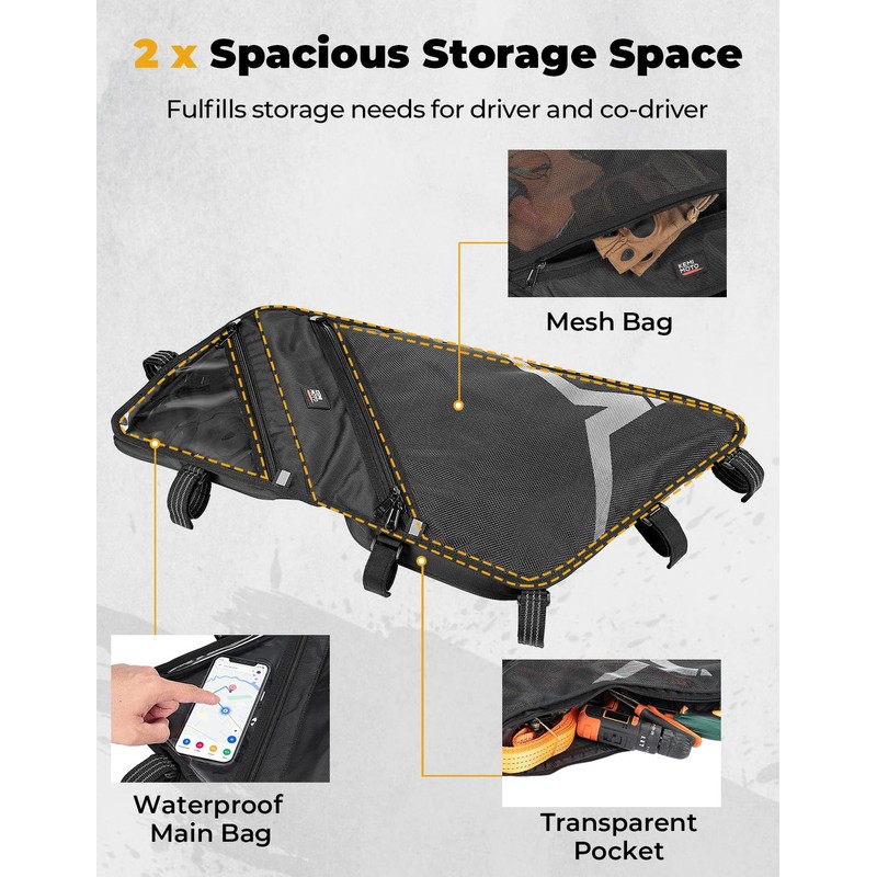 • Easy to install: KEMIMOTO overhead bag is fastened with anti-slip strap, making it simple to install and remove. Additionally, it is compatible for use with UTV roof as well.
