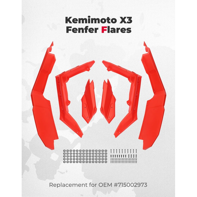 - Easy Installation: Kemimoto x3 flares contain all necessary self-taping screws and installation instructions, they are pre-drilled and adopt a direct bolt-on design, drilling small pilot holes will help to finish the installation quickier on your own. And they can work with x3 Fender flare extensions