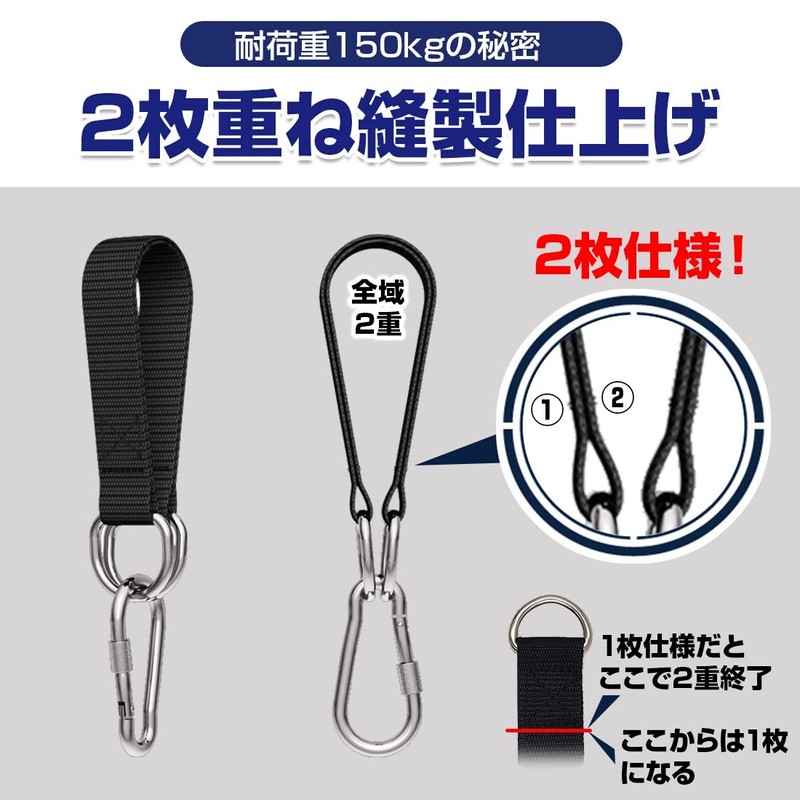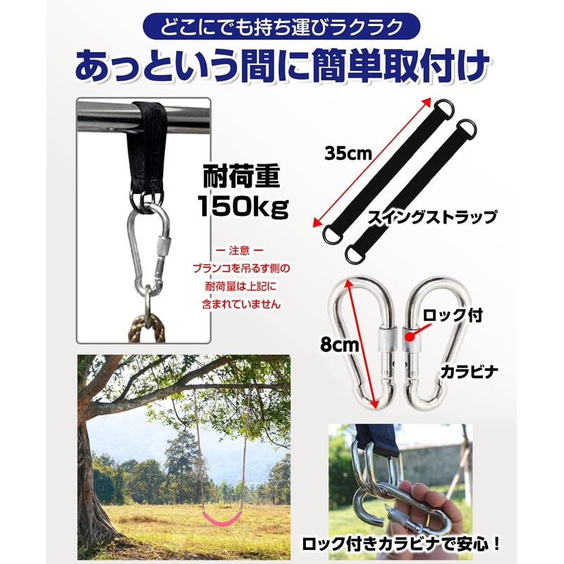 - How to Install: 1. Attach the swing strap to a safe location. 2. Attach the carabiner to the end of the swing strap. 3. Hang the product you would like to use with a carabiner. 4. Please check that the carabiner is locked and take care of the safety of the surroundings. Specifications: Swing strap 13.8 inches (35 cm) (2 pieces) with lock x 2 carabiners, load capacity 330.7 lbs (150 kg) *PL insurance product *Kenkoba Hands" is a registered trademark