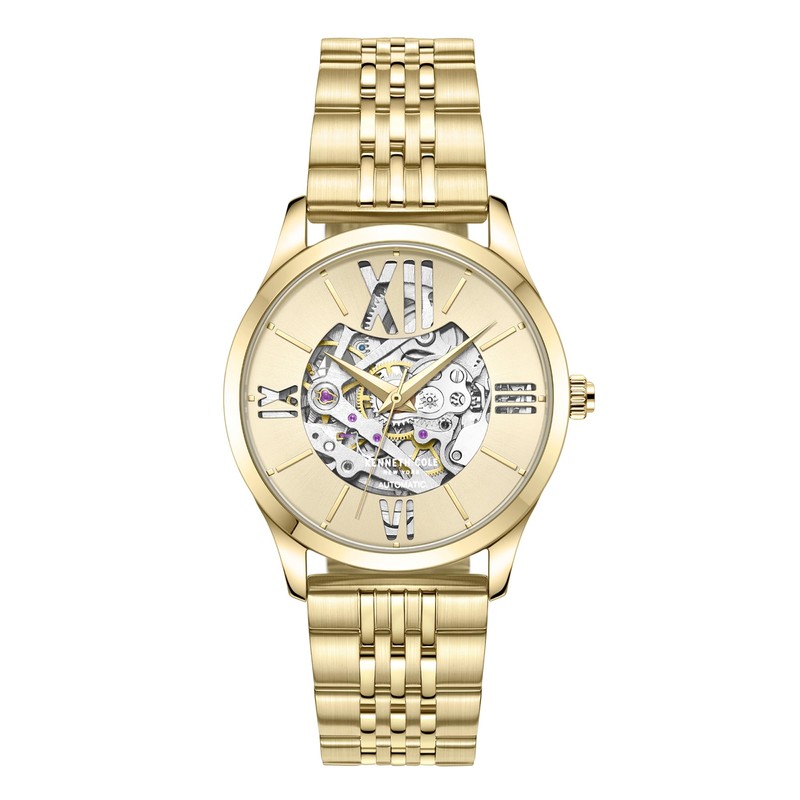 • Kenneth Cole New York ladies watch features a three-hand automatic movement with gold-tone 34.5mm case. The open work champagne dial reveals the complexity of the mechanical movement. The watch is complimented with a gold-tone bracelet.