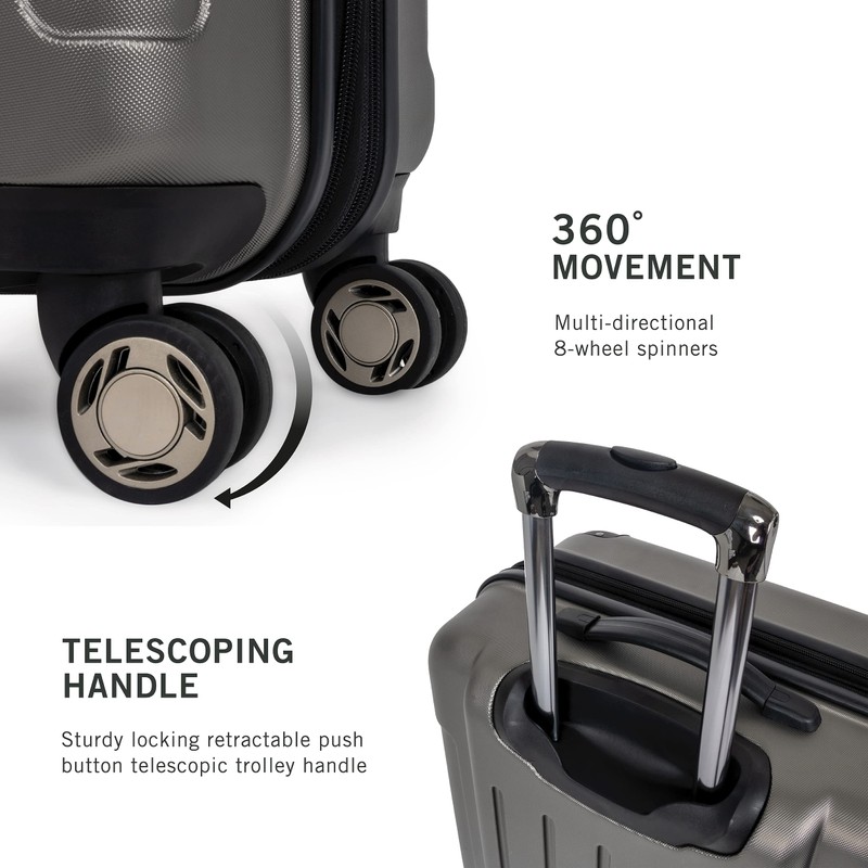 - WHY HAVE 4 WHEN YOU CAN HAVE 8; 360-degree spinner wheels that maneuver easily across all surfaces.