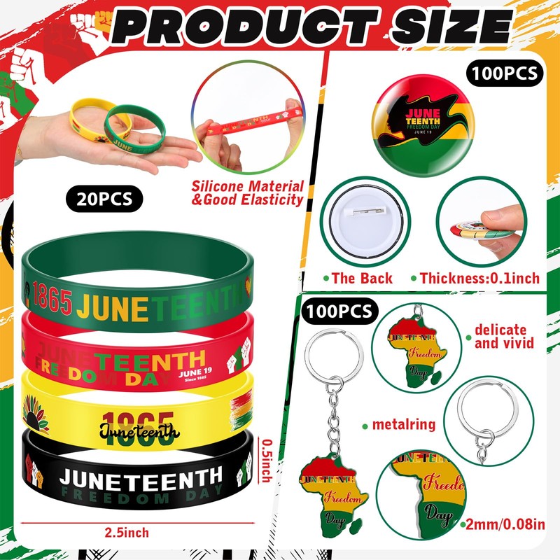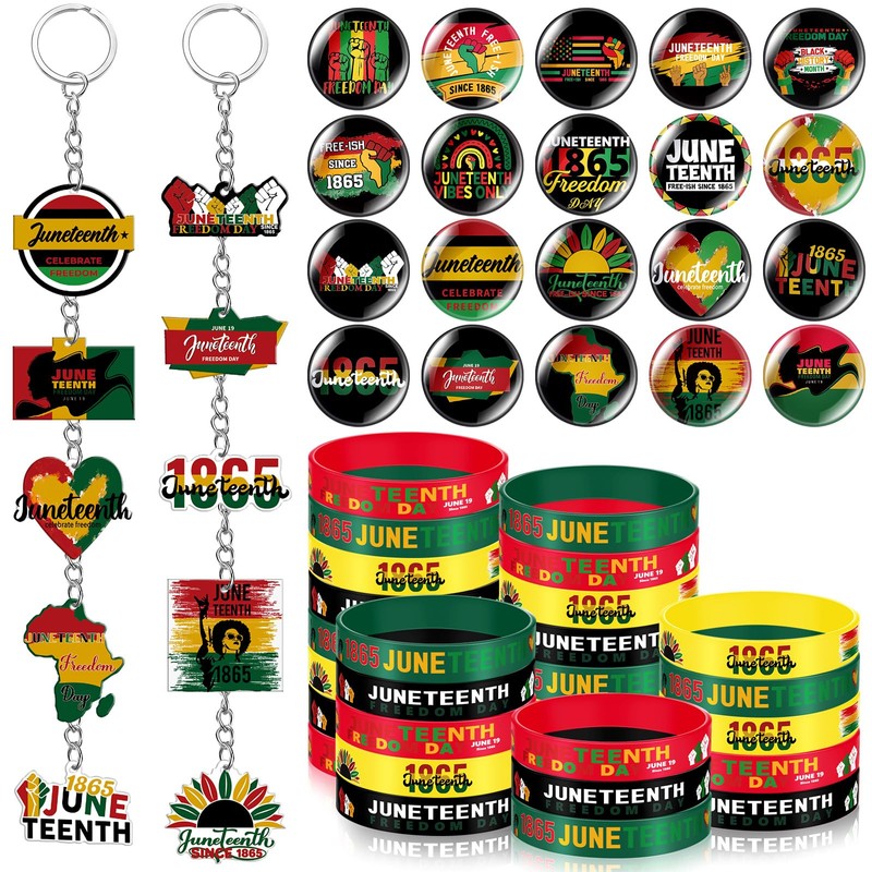 - Celebrate Freedom with Juneteenth Bundles: Showcase pride and culture with this Juneteenth accessory set, including 100 silicone bracelets in 4 bold designs (25 each), 100 button pins featuring 20 distinctive styles (5 each), and 100 keychains in 10 vibrant designs (10 each). Perfect for parties, events, and meaningful celebrations