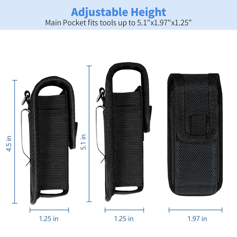 - Adjustable Height: Size is 2"x 1.25" x 4.5"~5.1" The height of our multitool pouch is adjustable, that easily adjust cover to fit tool up to 5 inch in length. Compatible with Leatherman Wingman, Wave, Charge, Surge, Skeletool, Super Tool and other brands like Victorinox Swiss Army, RoverTac, Gerber. You can also carry an EDC flashlight and mini marker pen.