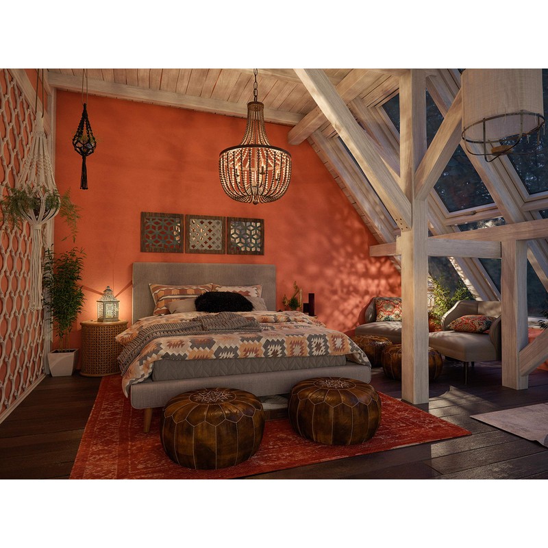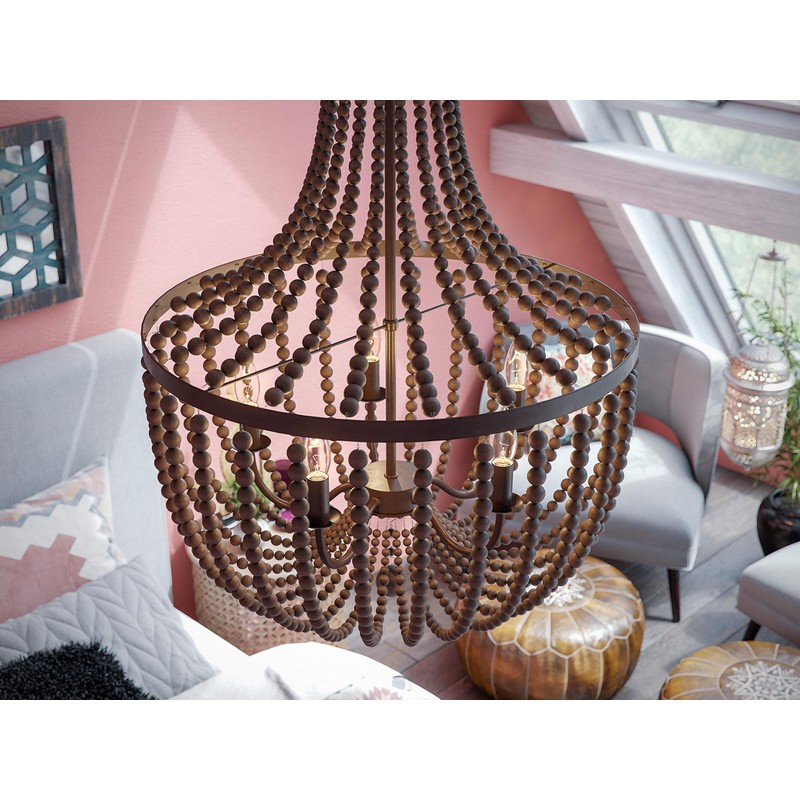 - BOHO BEADED BEAUTY: Delightfully casual, natural wooden beads suspended from a 22-inch diameter frame in this beautiful bohemian statement piece. The gray wooden beads provide a rustic element to the golden bronze-finished frame, perfect for adding a soft, organic touch to your industrial dining room, natural modern grand entryway, or boho coastal bedroom.