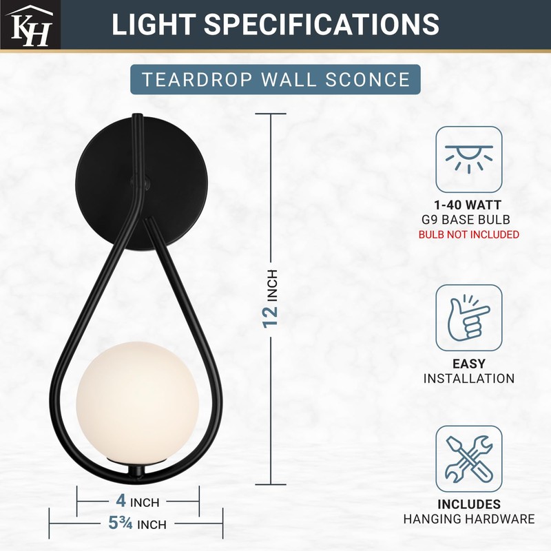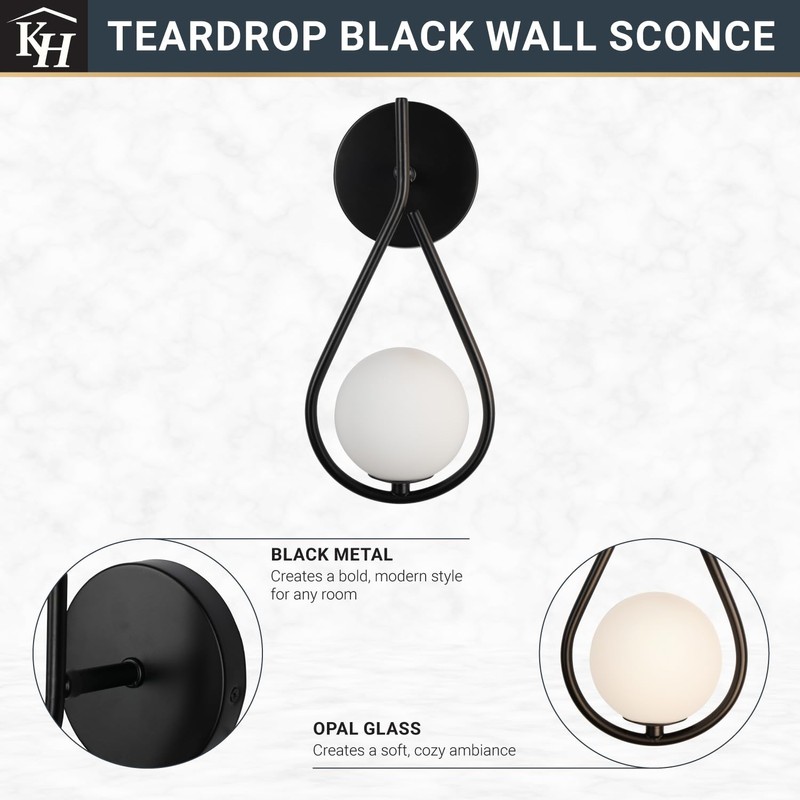 • QUALITY CONSTRUCTION: The Kenroy Home Teardrop Wall Sconce is constructed of a sleek black metal base and features a frosted opal glass globe cover
