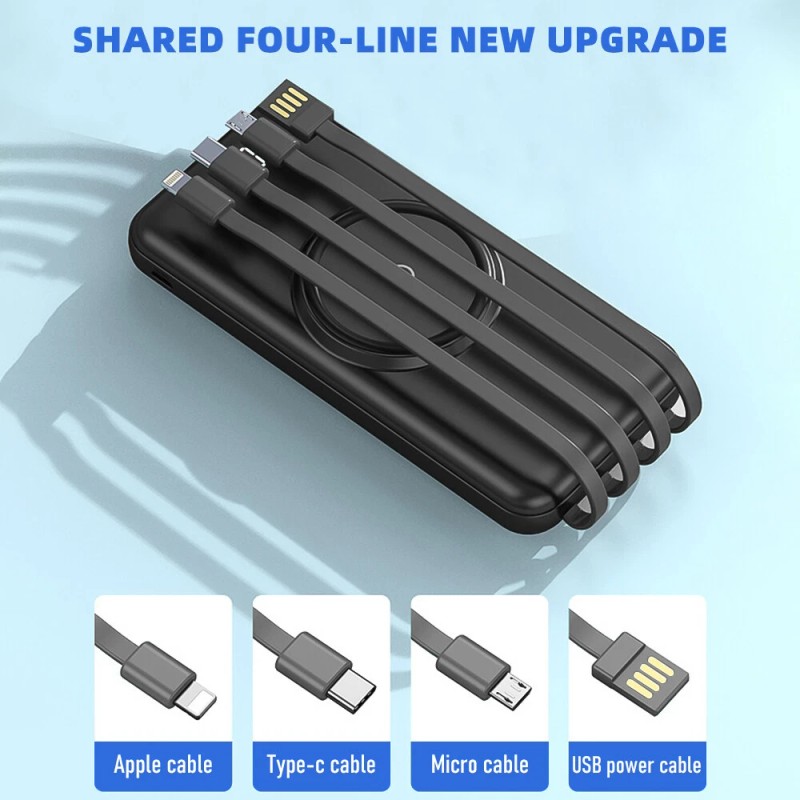 【Built-in 4 cables + 15W wireless charging】Wireless portable charger supports 5W/7.5W/10W and 15W MAX wireless fast charging; Built-in 3 5V2.1A output cables, for iPhone, Type-C, Micro, and1 USB input cable.