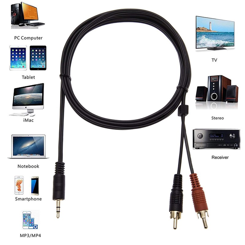 Stereo Y Cable enables you to connect your PC's sound card, notebook, CD Player, MP3, iPod, Iphone, or other audio sources with a 3.5mm (1/8) headphone stereo jack to your home stereo system and easily.