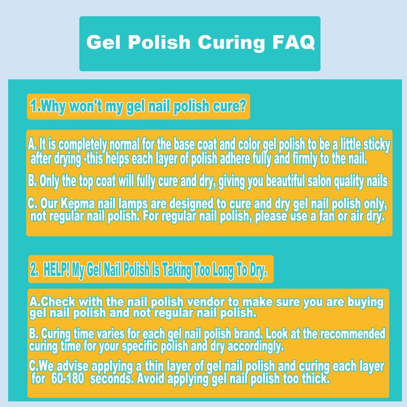 - 1.Attention Please: The lamp works well with GEL nails but not for TRADITIONAL nail polish Dual light sources (wavelength 365nm+405nm), makes it works fastly with gel nail polish(top coat/base coat/color gel),gel stickers and uv resin,but not for traditional nail polish. The traditional nail polish needs to be air dried rather than curing by uv nail lamp.