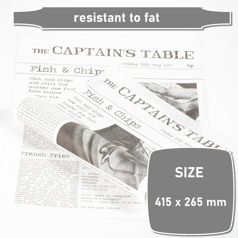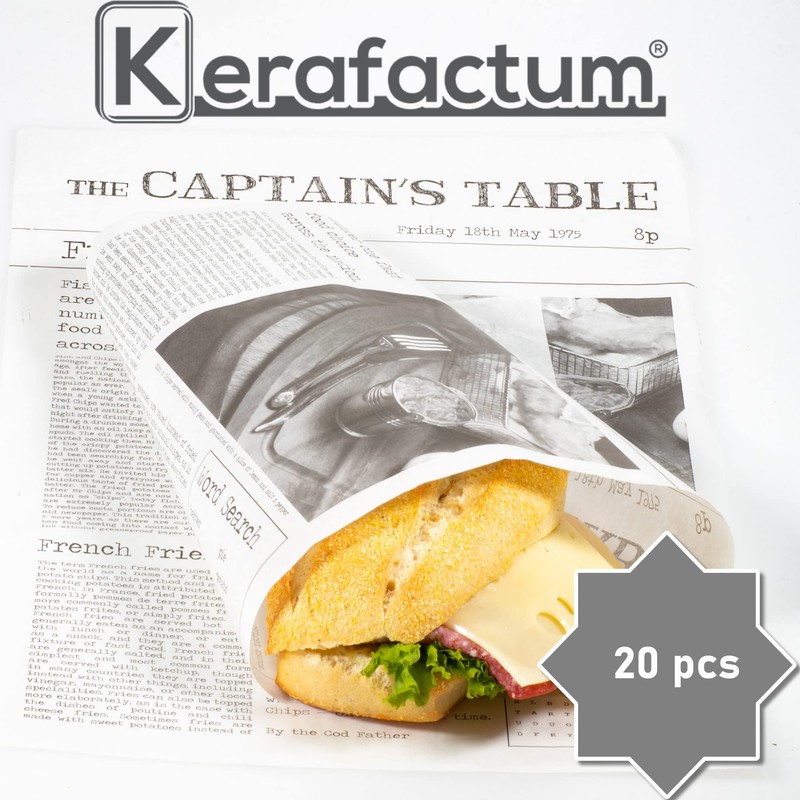 - Best brand quality from Kerafactum, pack of 20 greaseproof wax leaves for chips bags, potato sticks for fish and chips, French Fries motif, daily news, size 26.5 x 41.5 cm