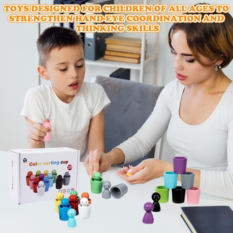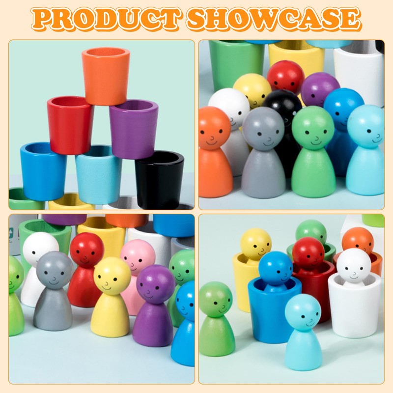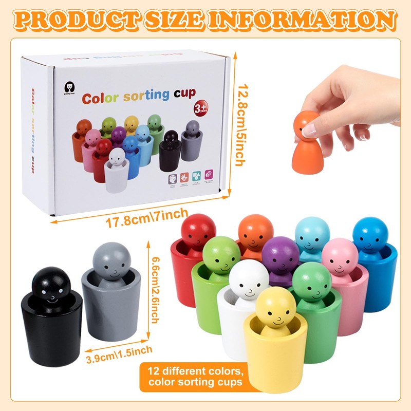 - Montessori toy: our wooden play set contains 12 different coloured cups and 12 different coloured figures. Children can try different activities such as sorting, stacking, counting and imaginative play