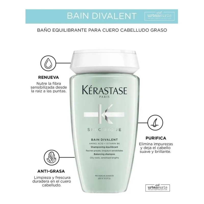 Sumérgete en el mundo de Kérastase Bain Divalent, un elixir diseñado especialmente para aquellos que buscan equilibrar la naturaleza rebelde de su cuero cabelludo graso. Con cada gota, este champú revolucionario purifica y revive, transformando tus raíces en un oasis de frescura y ligereza. 🌿