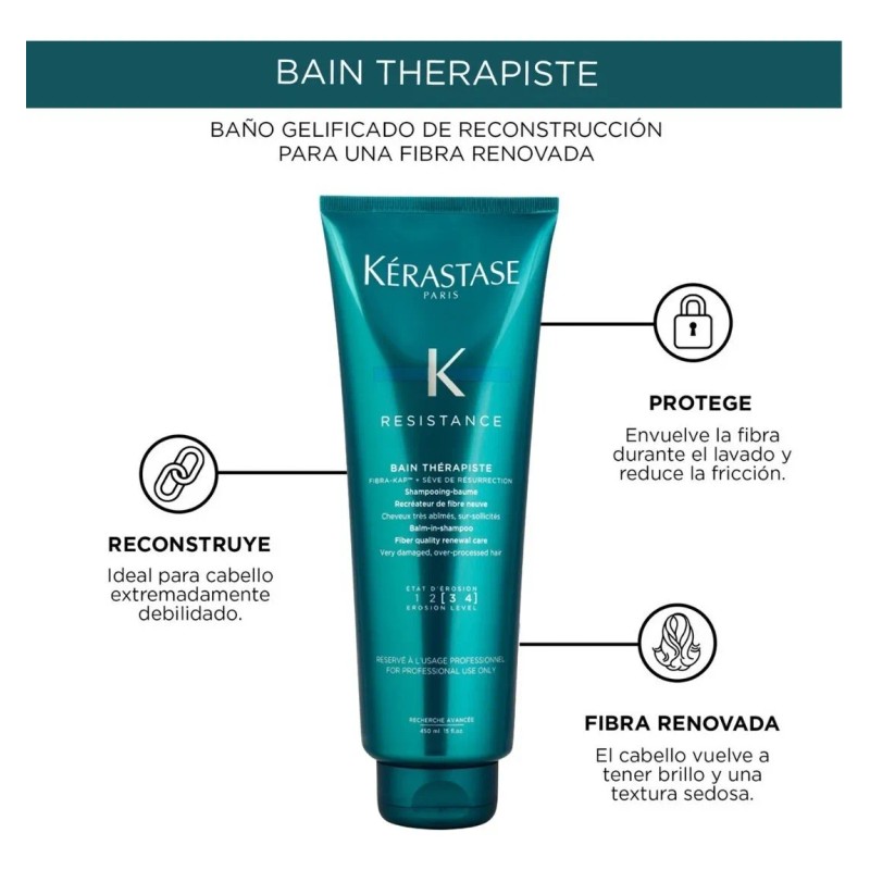 Sumérgete en una experiencia de cuidado capilar sin igual con Kérastase Bain Thérapiste. Este exquisito shampoo es el secreto detrás de un cabello que irradia salud y vitalidad. Diseñado especialmente para transformar y revitalizar incluso las melenas más dañadas, cada gota se convierte en un abrazo reparador que reconstruye la fibra capilar desde su núcleo. 🌟