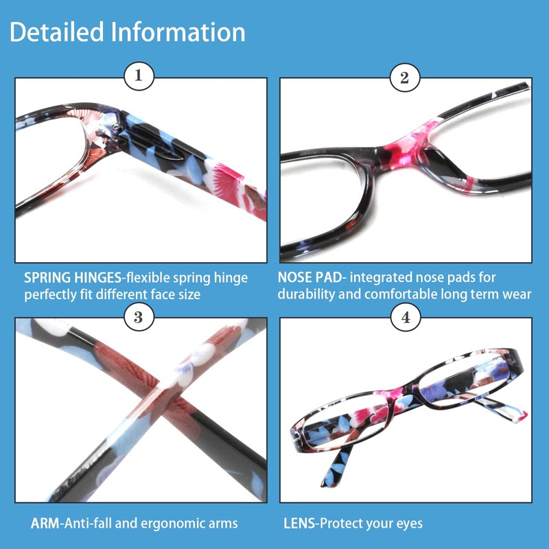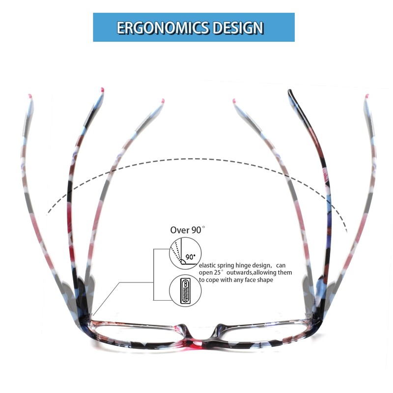- Spring hinges: These reading glasses come with spring hinges. Compared with traditional reading glasses, the frame of the spring hinged glasses can be opened outward by 25 degrees, reducing the pressure on the head when wearing, and perfectly fitting the face shape. The integrated nose pad design makes it difficult for reading glasses to slide off the face.