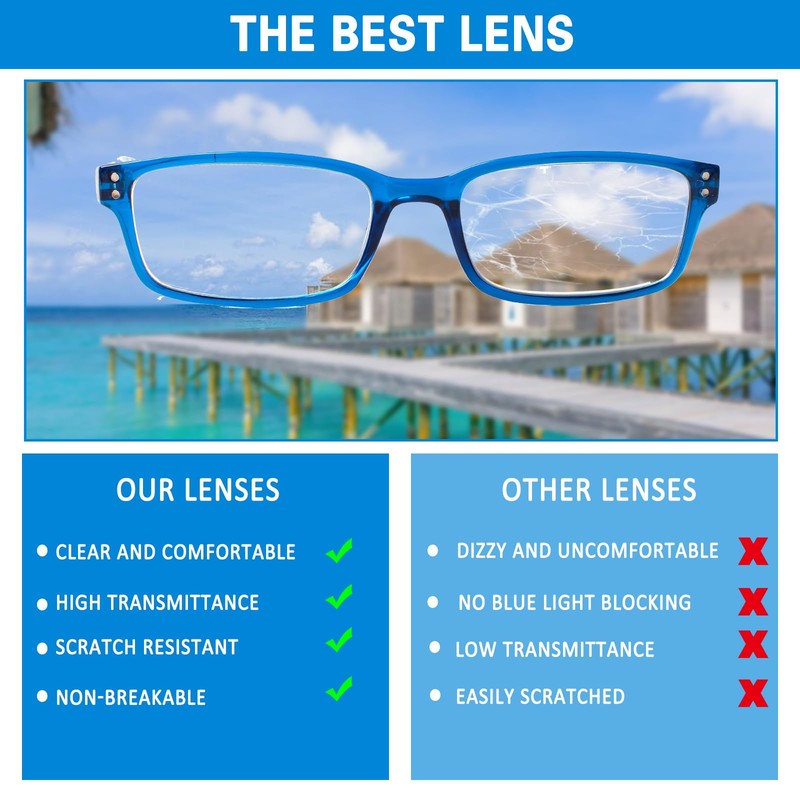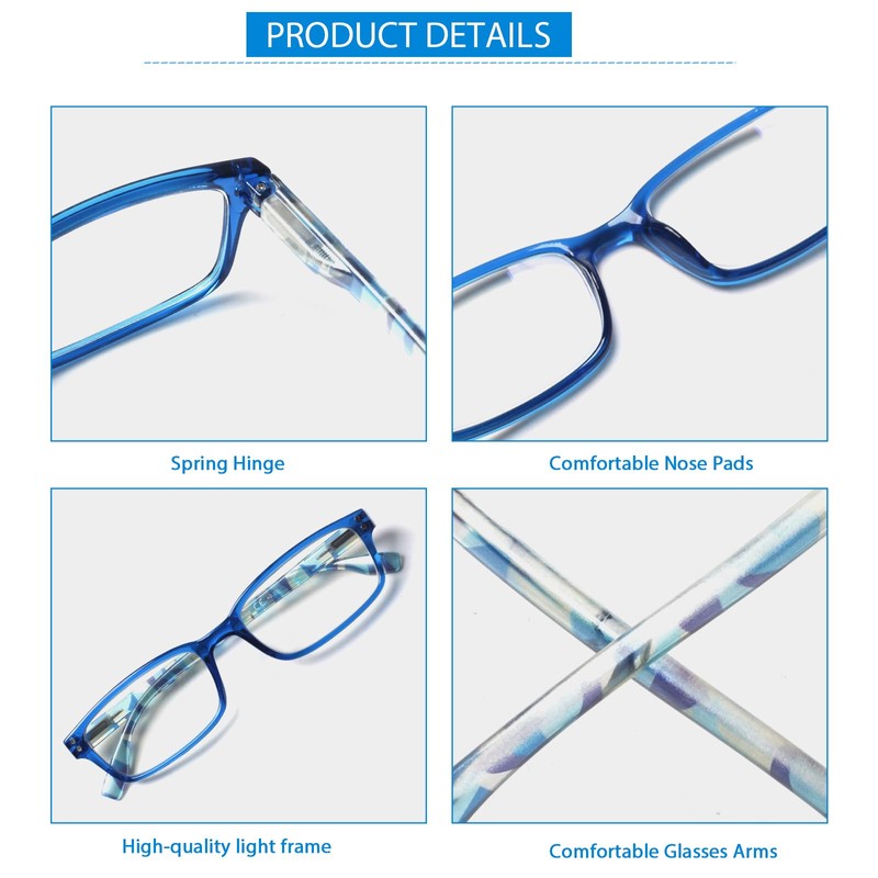 - Comfortable to wear: rectangular frame, durable and lightweight, does not put pressure on the nose and is suitable for long wear; high definition lenses that block blue light strike the perfect balance between accurate magnification and true color.