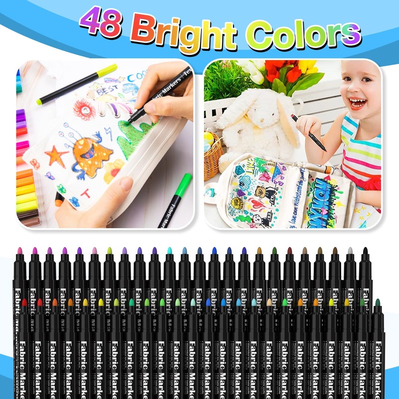 KERIFI 48 Textile Pens Textile Paint Machine Washable Textile Markers Fabric Painting Pens Fabric Paints Washable for T-Shirt Fabric Bag Bib Cotton Bag for Painting Craft Set Children's Birthday Party