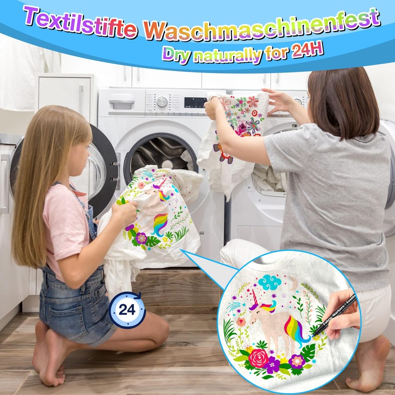 - Machine washable textile pens: textile markers are machine washable. The set of fabric colouring pens is non-toxic and odourless, non-fading materials for the fabric paints, washable. (Tips: 1. Please wait more than 24 hours before washing. 2. Wash at a water temperature below 30 degrees and use a mild detergent)