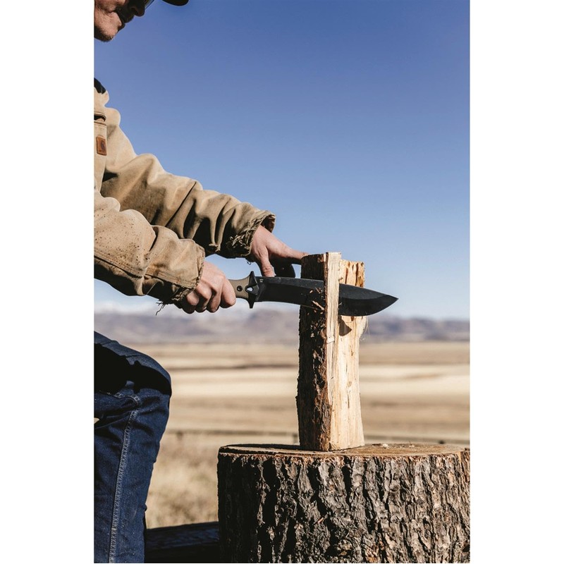 - Blade steel selected for quality and durability according to use; 65Mn boasts toughness for hard use applications; measures 56 on Rockwell Hardness Scale (HRC); black powdercoat makes maintenance easy.