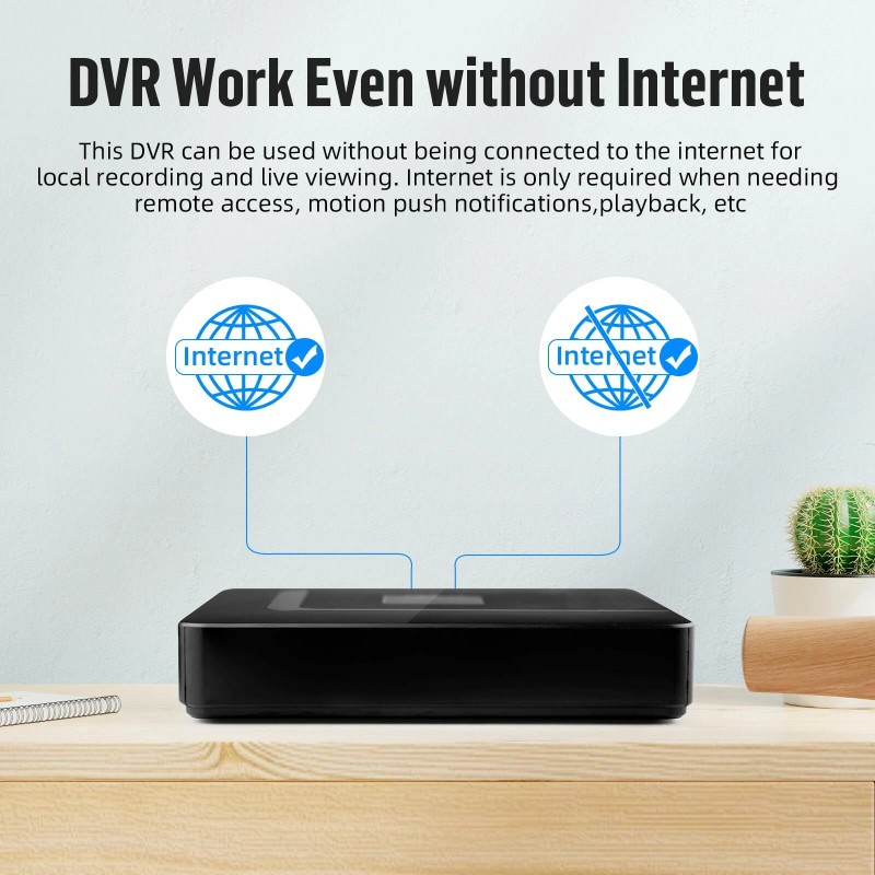 • 【DVR Work Even without Internet 】The series DVR can be used individually or online applied as a part of a safety surveillance network. - The recording goes on with an HDD inserted in the DVR, even without the Internet. No WiFi Worries: Say goodbye to WiFi dependency! They don't connect to your network or the internet; long-range coverage without compromising your privacy.Internet is only required when needing remote access, playback, etc.