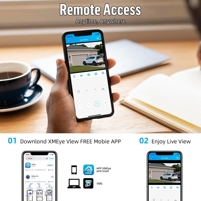 • 【Instant Alerts】The system can detect anything unusual with the advanced algorithm and push real-time app notification and email alerts with snapshots, when there are motion events.Install download “XMEye” or ‘’lcsee”View free mobile APP through scanning QR-code or download from APP store.With the free APP, You Can Remote View or via Smart Phones, Tablets, Notebook or PC. Access the system directly to see the motion-triggered events and take actions at once to prevent the intrusion.