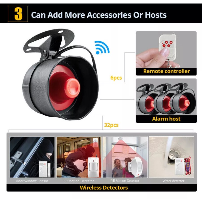 Can add more accessories or Hosts.one sensor can work with more then two siren alarm hosts.Can be placed in different areas.