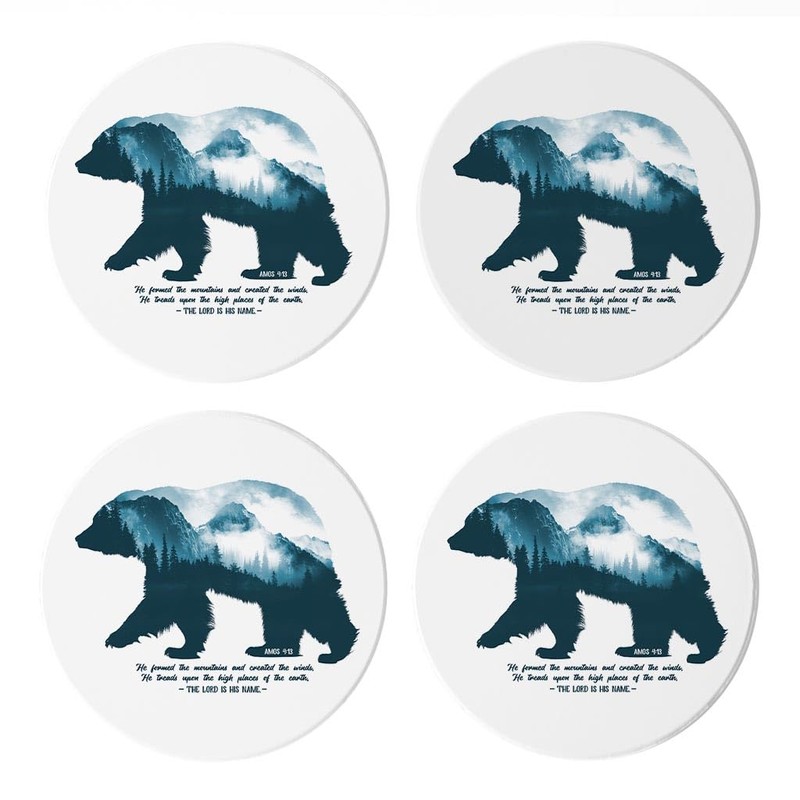 • Sold as a set of 4; Add a splash of personality to your tabletops with these stylish and functional coasters; Presents sentiment "He formed the mountains and created the winds, He treads upon the high places of the Earth; The Lord is his name"