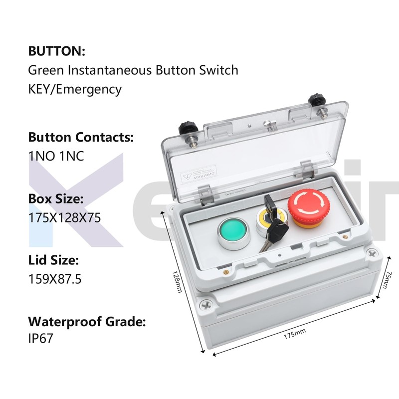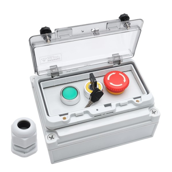 - Package Includes:1*Waterproof Box+1*Green Button+1*Red emergency stop button switch+1*Lock Push Button Key Switch+1*Waterproof Cable Connector