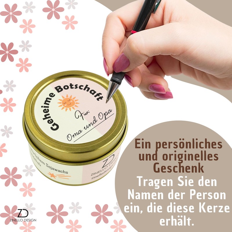 Jede Kerze kann mit dem Vornamen der Person personalisiert werden, die sie erhalten wird, direkt auf den Behälter geschrieben. Ein einzigartiges Geschenk, das zu einer kostbaren Erinnerung an Ihre Schwangerschaftsankündigung wird.