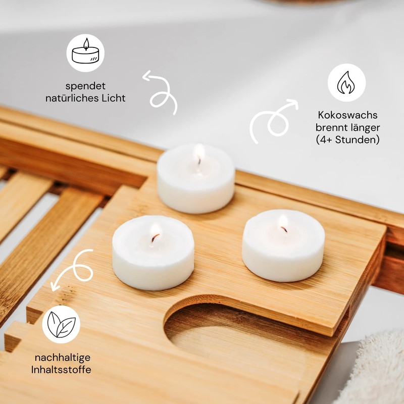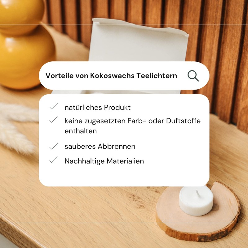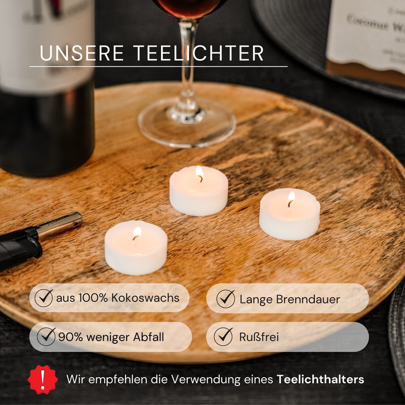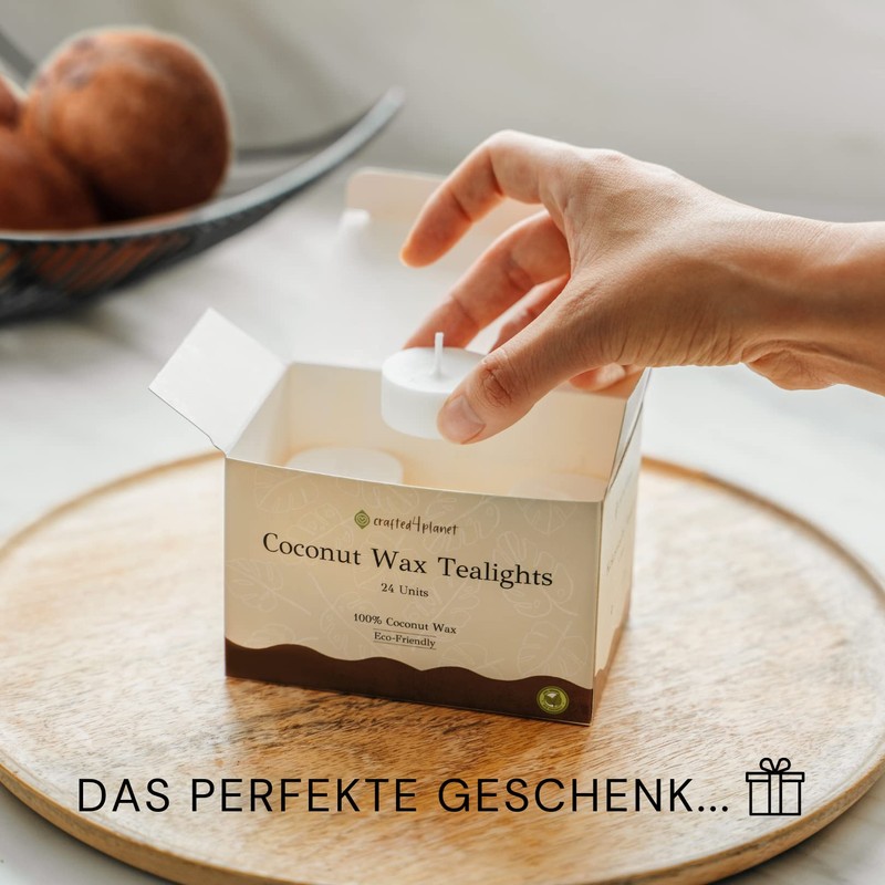 Our tea lights meet the highest quality standards. They are perfect for bringing the family light of the Christmas season into your home and open up great decoration possibilities for holidays and celebrations. Our vegan candle has a beautiful, bright flame and burns for up to 4 hours in optimal conditions. The creatively designed packaging includes 24 tea lights without case. The coconut candle is without fragrance and therefore odourless. The vegetable coconut wax has a natural white colour. Therefore, our coconut tea lights in a white design are also available. As our coconut candles come to you without aluminium or plastic holder, the use of tea light holders is recommended. They are therefore also particularly suitable as refill tea lights for candles glass containers. Sustainability The protection of nature and our resources is important to us. That's why our sustainable soy wax organic tea lights are free from: Palm oil, paraffin and animal products => vegan! Since coconut candles do not contain toxins, carcinogens or harmful substances, they are less likely to cause allergies. Coconut wax is much healthier for us and the environment. The coconut wax is a natural wax obtained from the flesh of the coconut.