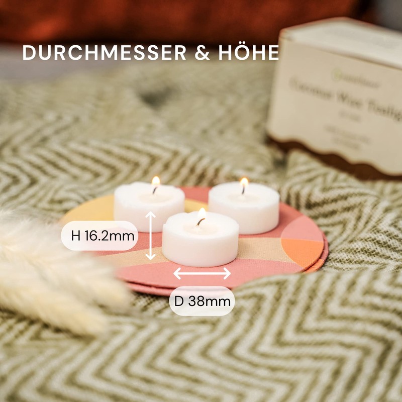 - Tea lights large pack – the package contents include 24 sustainable tea lights – diameter 38 mm, height 16 mm