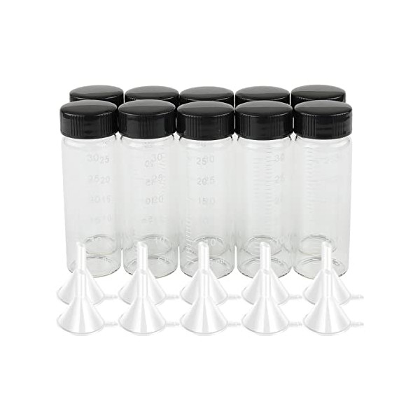 Kesell 10 Pack 30ml (1 oz) Glass Sample Vial Clear Graduated Measuring Bottles Empty Reusable Liquid Vials with Plastic Screw Cap and 10 Funnels