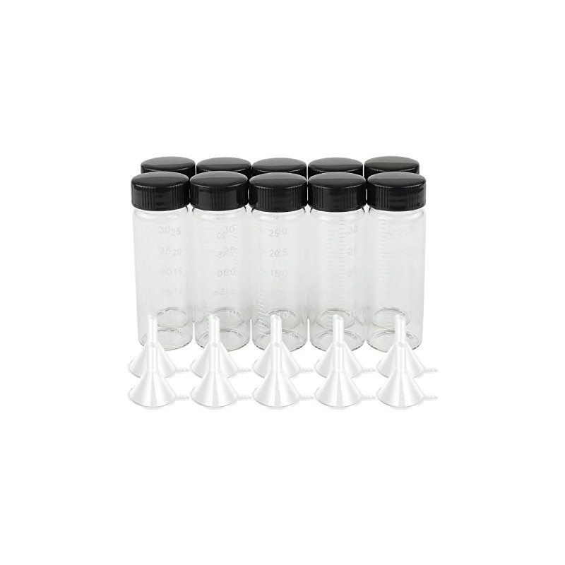 - Great Value 30ml (1 fl oz) Lab Sample Vial Set: 10pcs glass graduated bottles + 10pcs plastic funnels