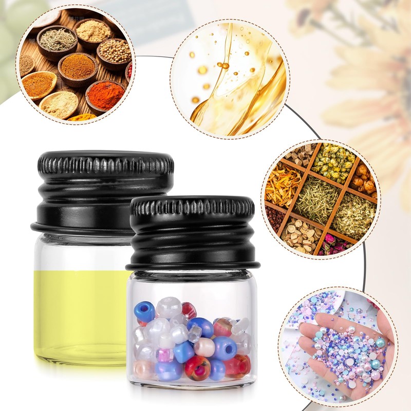 • Versatile Glass Jars: Glass vials with aluminium caps are ideal for organizing spices, creating homemade perfumes, or storing beads and other crafting supplies