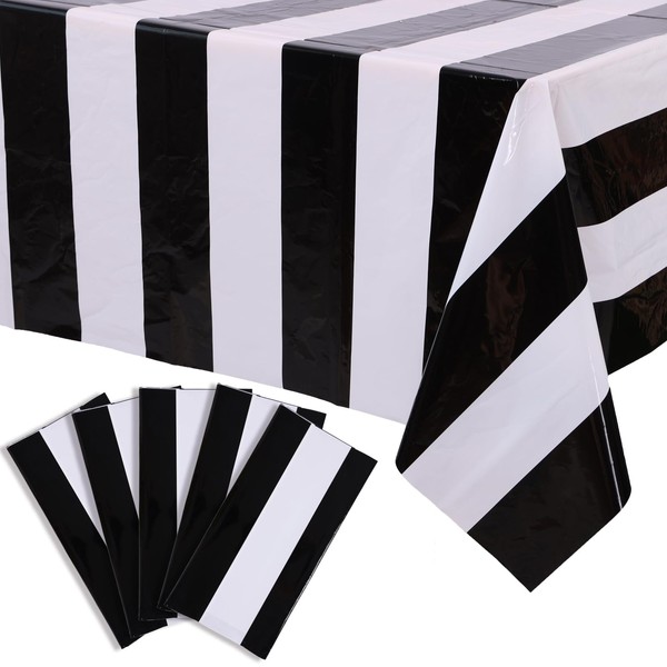 Kesfey 5 Packs Black and White Horizontal Striped Table Cloth 54 x 108 Inch Classic Black Stripe Tablecloths Disposable Plastic Stripe Table Covers Waterproof Picnic Tablecover for Camping Party