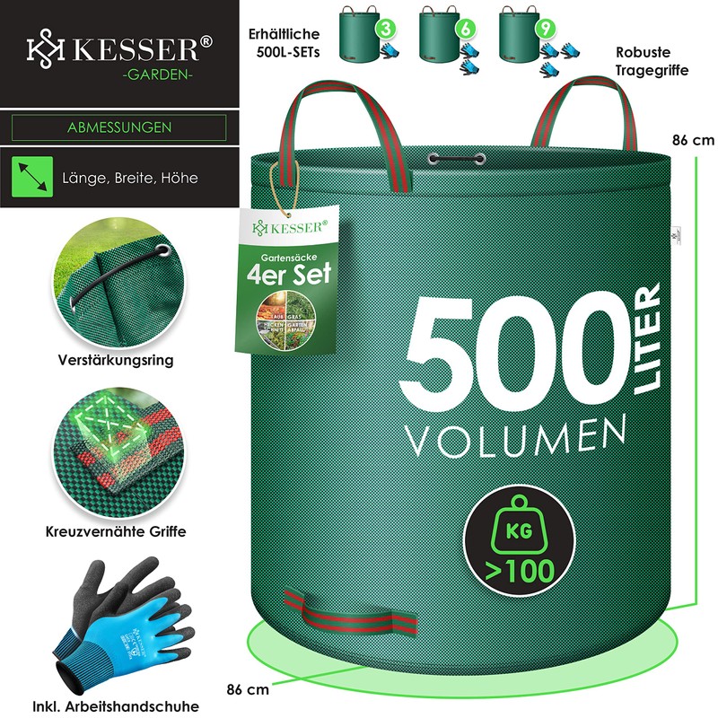 - Robust material: the KESSER garden bag is not only a simple bag for garden waste, but a versatile and robust tool for everyday use in the garden, on the farm or in the workshop. It offers a generous capacity of 272 litres or 500 litres to carry large amounts of waste or materials. Thanks to the durable 150 g/m² propylene fabric, it remains stable and tear-resistant even under heavy loads.