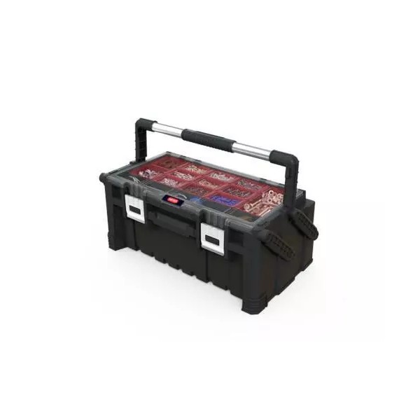 Designed with active professionals, DIYers and home craft enthusiasts in mind, this heavy-duty cantilever tool box offers quick and easy access to different sized tools, as well as smaller accessories. When you open the box, the smart cantilever system shows all your contents in a single-view. A spacious interior holds your larger items while the two large removable bins and nine standard bins on top keep small parts perfectly organized. This tool box is constructed of heavy-duty polyproplyene resin body and a smash-proof polycarbonate lid. It features metal latches and a sturdy metal handle for extra durability. The back support legs keep everything stable when in the open position. Transporting this tool box is easy and comfortable with the full length soft-grip handle.