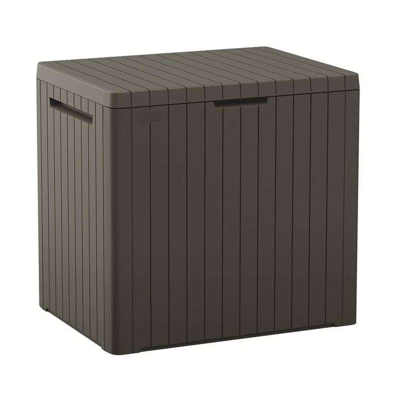 Keter City 30 Gallon Resin Outdoor Storage Box and Patio Furniture Side Table for Pool and Garden Accessories, Taupe