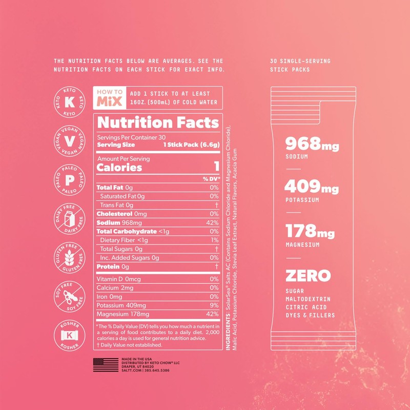 Keto Chow SALTT Electrolytes Powder Flavored Drink Mix - Fruit Variety - 90 Hydration Packets - Magnesium, Potassium, Sodium, Trace Minerals - Zero Sugar & Gluten Free - 3 Packs of 30
