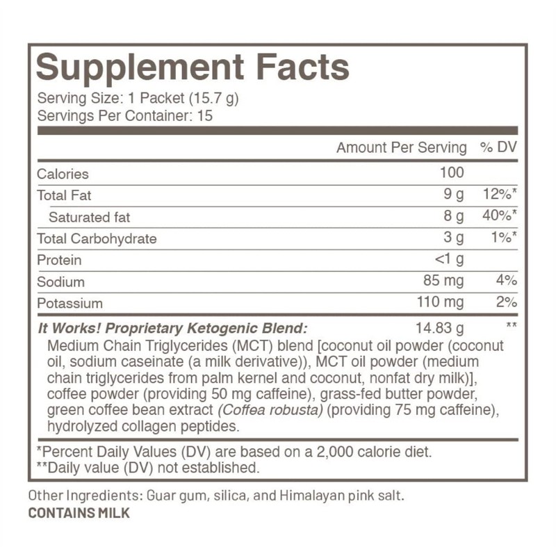 - Disfruta del delicioso sabor de Keto Coffee Café Soluble It Works Instantáneo en tu hogar u oficina. Este café de alta calidad viene en una bolsa que contiene 30 sobres individuales, cada uno con una combinación perfecta de café, moca y vainilla. Con un peso de 472 gramos y dimensiones de 20.6 cm x 8 cm x 28.1 cm, esta práctica bolsa de café soluble es fácil de almacenar y transportar. Además, es cetogénico y bajo en carbohidratos, lo que lo hace ideal para aquellos que siguen una dieta keto. Prepáralo en cualquier lugar y disfruta de una taza de café deliciosa y satisfactoria en cualquier momento del día. ¡Ordena ahora y experimenta la diferencia de Keto Coffee Café Soluble It Works Instantáneo!