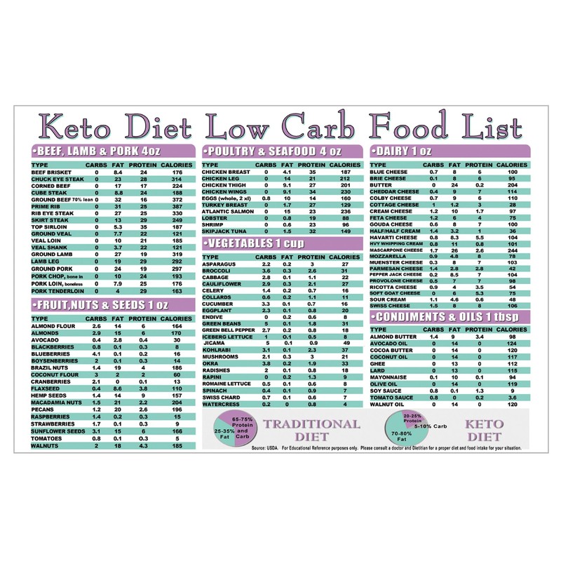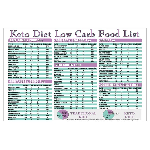 • KETO DIET LOW CARB FOOD LIST CHEAT SHEET QUICK GUIDE - Details foods from Beef, Lamb, Pork, Poultry, Seafood, Fruit, Nuts, Seeds, Vegetables, Dairy and Condiments/Oils.