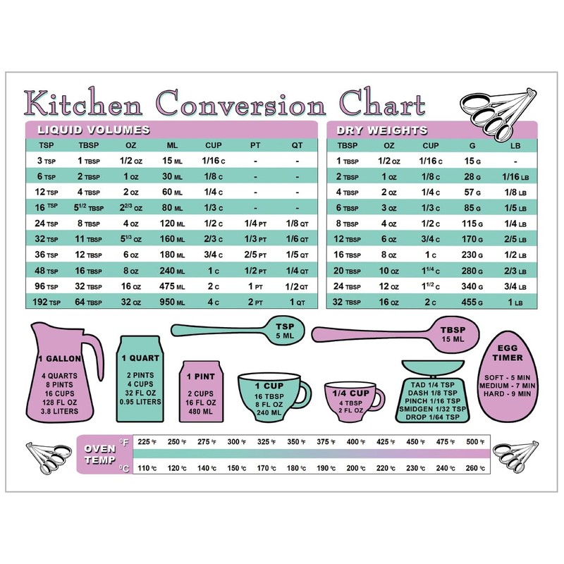 • KITCHEN CONVERSION CHART covers Teaspoons, Tablespoons, Ounces, Cups, Pints, Quarts, Gallons, Grams and Pounds in liquid volumes and dry weights. Oven temperature conversions between Celsius and Fahrenheit.