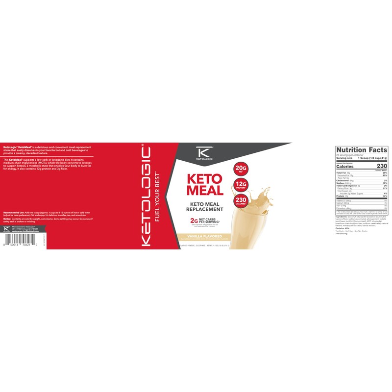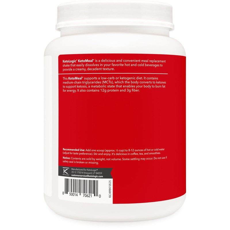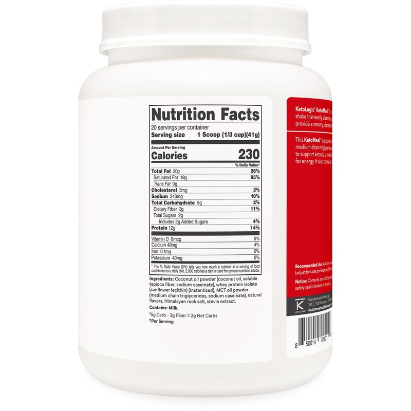 KetoLogic ketomeal with MCT Oil is everything you want and need in a Keto shake In addition to being delicious, KetoLogic ketomeal has the perfect macronutrient ratio to support a ketogenic and low-carb diet. The ideal fat to protein + carb ratio is 70: 30, which is exactly what our ketomeal formulation is. Our extensively researched and lab tested meal replacement keeps you full and satiated for hours.