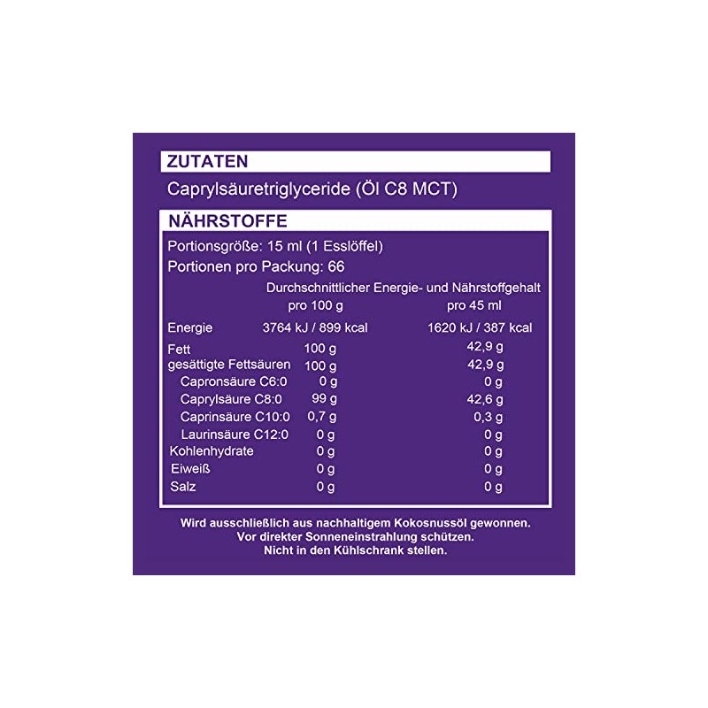 - EINFACH FR JEDE DI?T: C8 MCT ?l ist geruchlos, geschmacklos und kann herk?mmliche ?le ersetzen oder von ihnen ersetzt werden. Leicht in Protein-Shakes, Bulletproof Coffee oder anderenArten von Getr?nken fr nachhaltige Energie zu mischen.