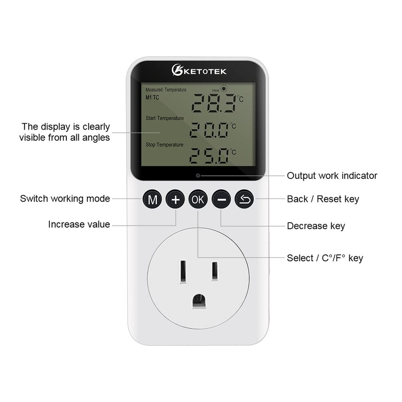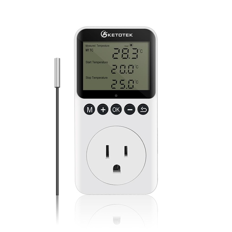KETOTEK Digital Temperature Controller Outlet Day Night Thermostat Plug Socket Heating Cooling Temp Controller with Sensor Timer Regulator for Reptile Greenhouse Brewing Refrigerator