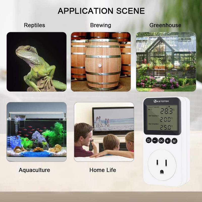 - 【Variety of Uses】Our thermostatically controlled outlet is an easy to use, safe & reliable temperature switch. It is widely used in heaters for reptiles, incubators, homebrew, greenhouse, aquariums, snake tanks, fermentation, infrared heater, accelerating germination, plants heating mat, freezer, refrigerator, etc.