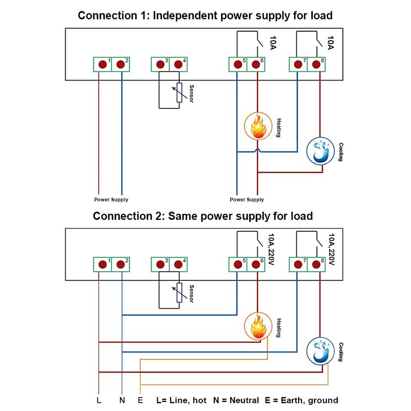 - Connect the heater and cooler at the same time: no more frequent switching of the wiring between the heater and the cooler. This temperature switch 230 V with sensor has 2 relays. Compared to other 1 relay temperature controllers, you can wire 2 devices (heater and cooler) at the same time. Please note that no sockets, wiring is required.