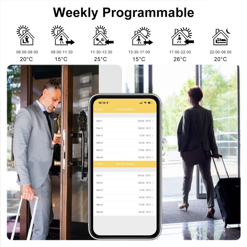 - 【Easy to Program】This underfloor heating thermostat for hot water supports automatic mode, manual mode and holiday mode. 5+2/6+1/7 weekly programming mode, 6 periods per day, supports maximum comfort and energy saving strategy.