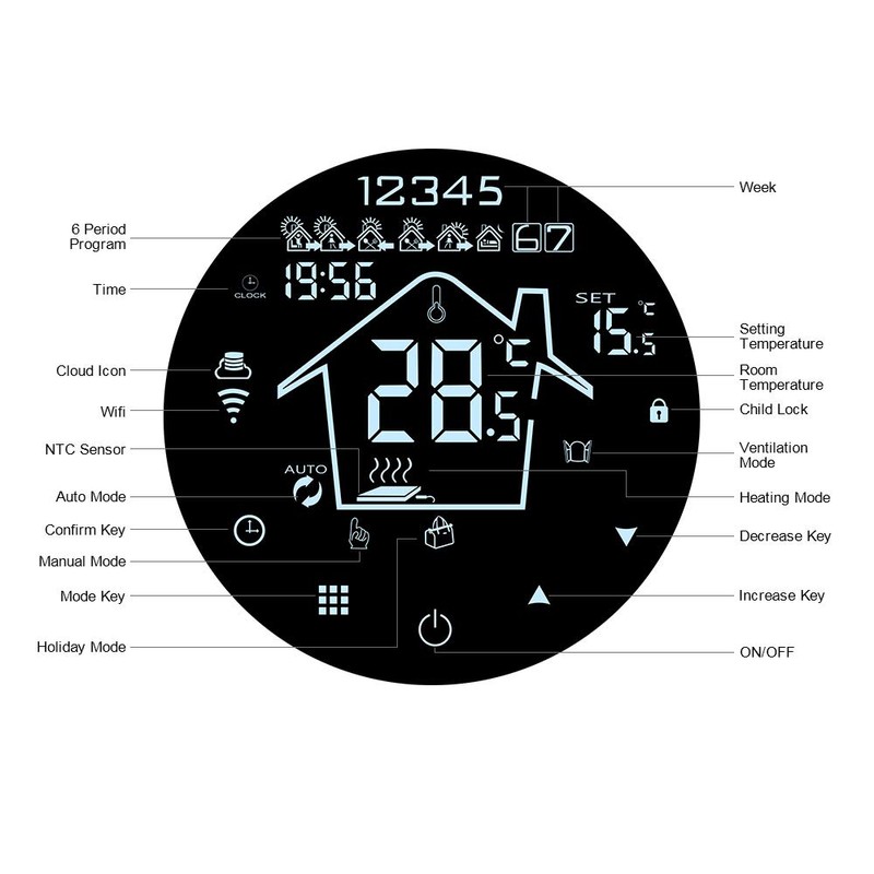 - 【Energy Saving】Activate ventilation function to facilitate energy saving. This water underfloor heating thermostat can be configured to detect a rapid drop in temperature (e.g. if a door or window is left open) and automatically shut down the heating to avoid wasting energy.