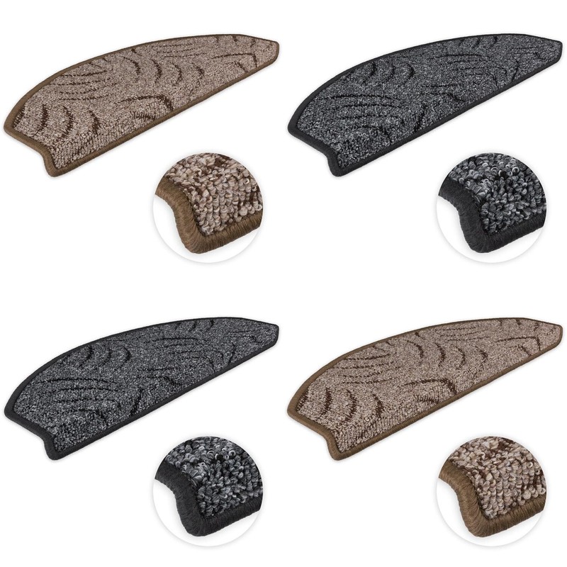 Prerow stair tread mat - semi-circular Let your bare stairs shine in a new splendour with our modern Prerow stair mats in a robust and very beautiful look. With stair mats, they not only increase the comfort of your home, but also provide more safety. High-quality durable textile fibres are used, which create a cosy and homely atmosphere. High quality is our claim. The quality is reflected in a total weight of 1100 grams per square metre and a number of nubs of 141,840 per square metre. Good sound improvement is achieved. The high-quality fleece backing is also responsible for this. The edges of the stair runners are equipped with a colour-coordinated and clean overlapping, so that fraying of the carpets is prevented. Thanks to the PVC angle rail, the step support is dimensionally stable and firmly anchored to the edge of the stairs. Cleaning For general cleaning, it is enough to vacuum the step mat or wipe it with a damp cloth. The material is very easy to clean and will not require intensive cleaning work. Due to the lighting conditions during product photography and different screen settings, the colour of the product may not be reproduced authentically.