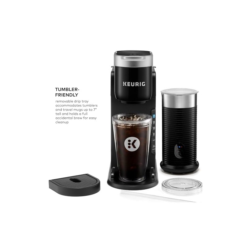 With the Keurig® K-Café® Barista Bar single serve coffee maker, you can enjoy all your go-to coffeehouse beverages — without the go. Easily create hot or iced favorites like creamy lattes, rich cappuccinos, and more at home with the included frother, or enjoy full-flavored iced coffee at the touch of a button. All your hot and iced coffeehouse favorites — always simply made, always delicious.In the mood for something indulgent? The K-Café® Barista Bar coffee maker lets you create any coffee beverage you're craving with its included milk frother. Just pour in fresh milk or your favorite dairy alternative such as oat, almond, or soy to make perfectly frothed milk in minutes. And with both hot and cold temperature settings, you can add froth to all your hot and iced beverages.Enjoying refreshingly delicious iced coffee is simple with the Brew Over Ice button. One push and the K-Café® Barista Bar coffee maker automatically adjusts the brew temperature, starting hotter to extract full flavor, then cooling down to minimize ice melt. The result is a vibrant, balanced iced coffee that never tastes watered down.Use any K-Cup® pod with the Shot button — which brews a 2oz coffee shot for a more intense, bold flavor — and you can transform your house into a coffeehouse with magnificent macchiatos, impressive iced lattes, and more delicious coffee creations.This multitalented, tumbler-and-travel-mug-friendly coffee maker also brews the same full-flavored hot coffee you love. And whether you're brewing hot or iced, you can choose from three different cup sizes — 8, 10, and 12oz (including ice) — and with a 42oz removable reservoir, you can enjoy up to 4 delicious cups between refills.